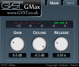 gmax est un limiteur de maximisation . l’ usage le plus commun est de renforcer la perception du niveau d’un signal en augmentant l’amplitude de base tout en évitant l’écrêtage. il fonctionne en augmentant d’abord le niveau de l’audio entrant par une quantité donnée. veillant à ce que le niveau ne dépasse jamais le niveau » plafond « . un limiteur est souvent utilisé pour agir sur une chanson entière qui semble » plus fort « , il peut également être utilisé à la place d’un compresseur pour aider à contrôler des pistes individuelles . Gain. plafond. Libération. mètre.